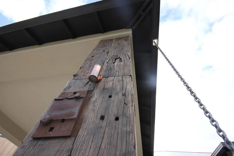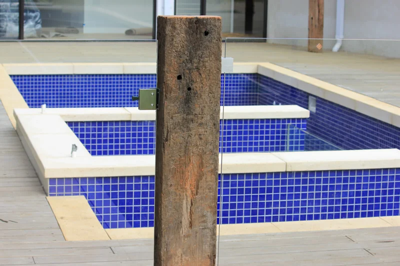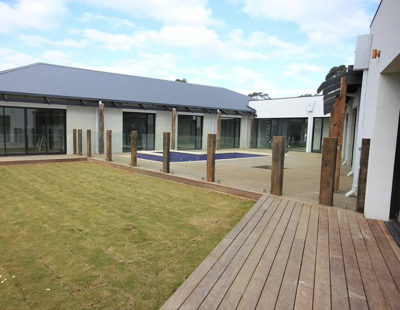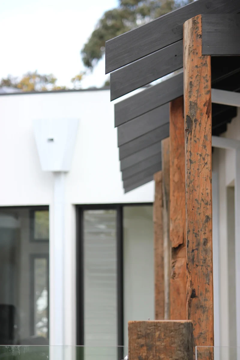 Inspired by the coastal setting of the Mornington Peninsula, the house has a distinctly "Australian" palette of materials, including sandstone + recycled native timbers, to create a timeless aesthetic. Recycled ironbark posts from an old railway bridge in NSW, where one of the owners grew up, were used around the pool and at the front to instil a connection between old and new.